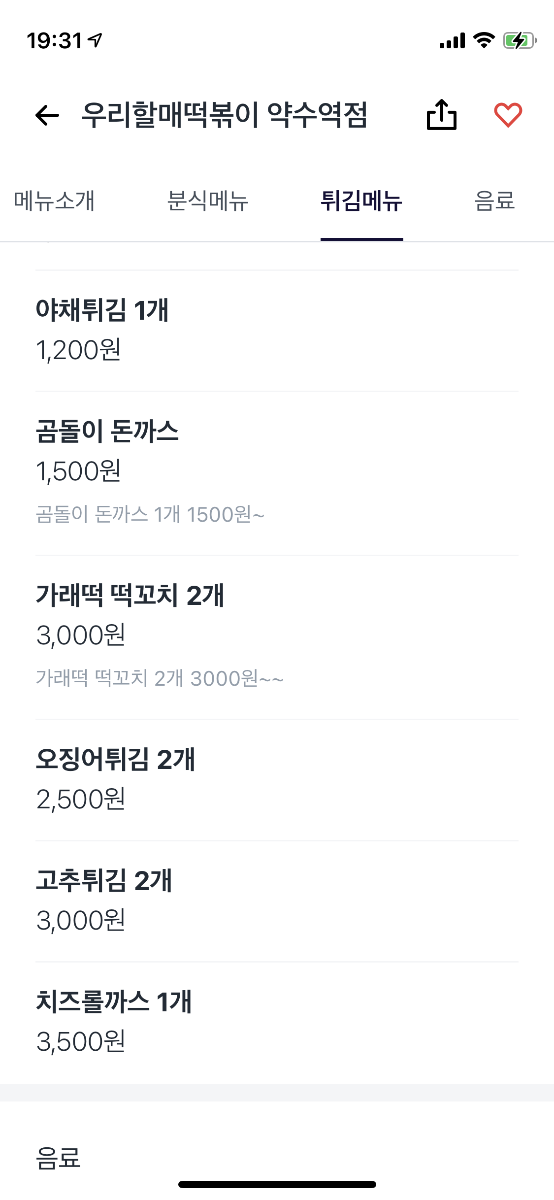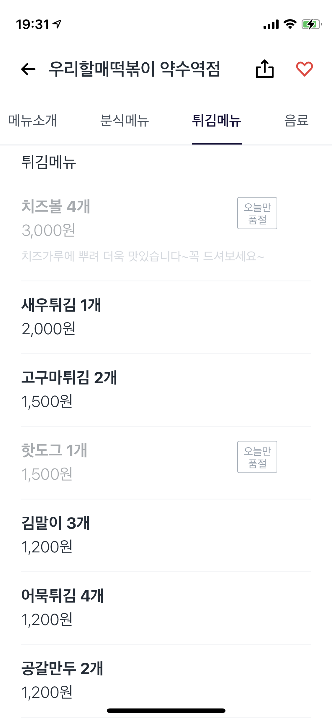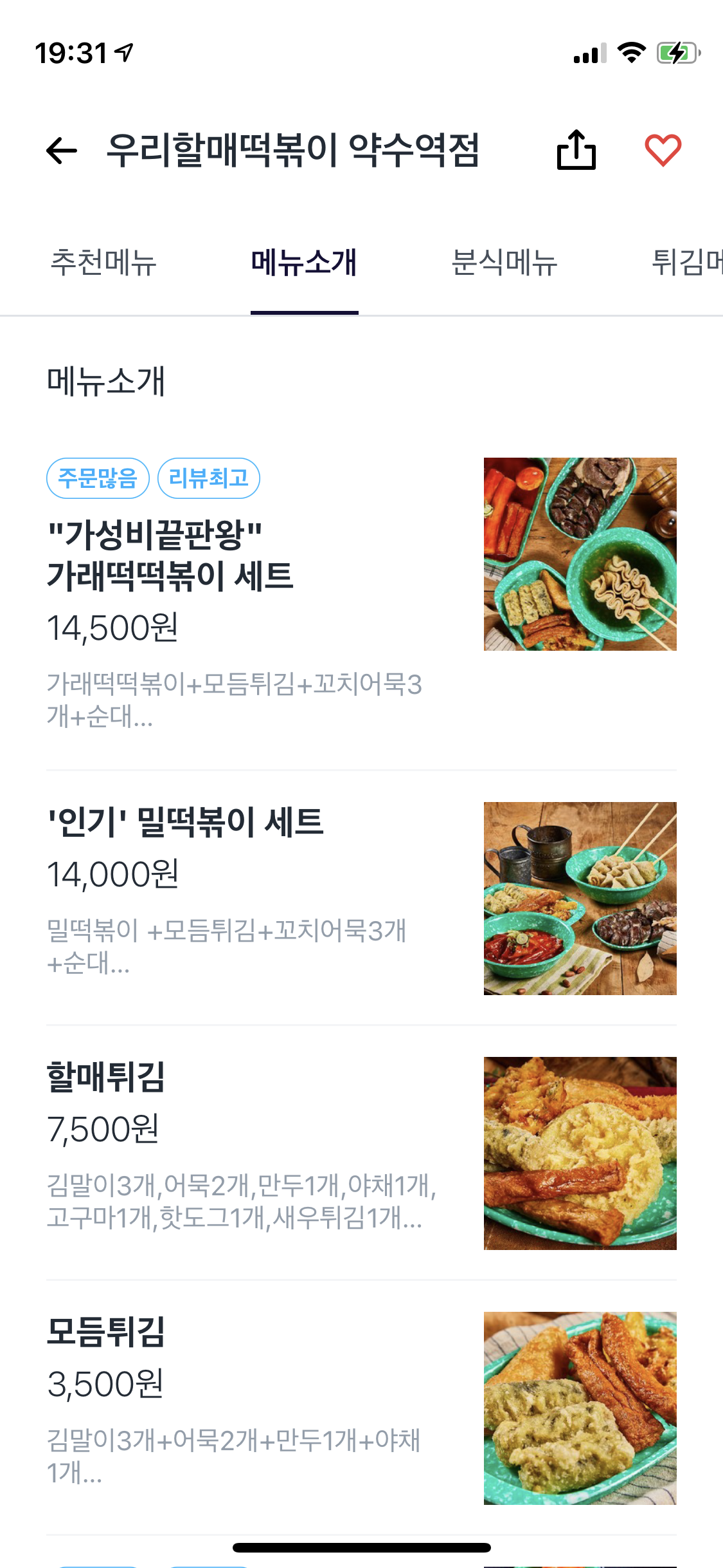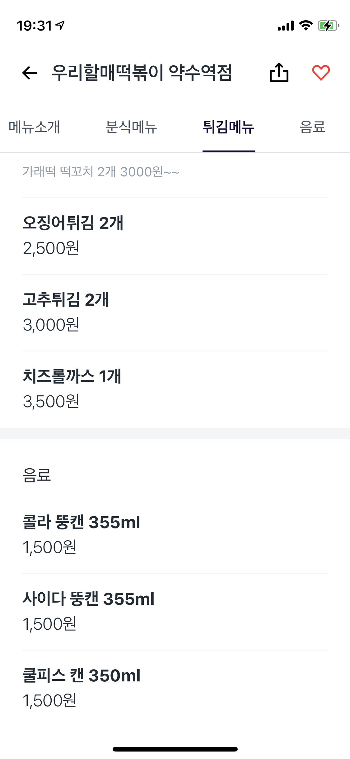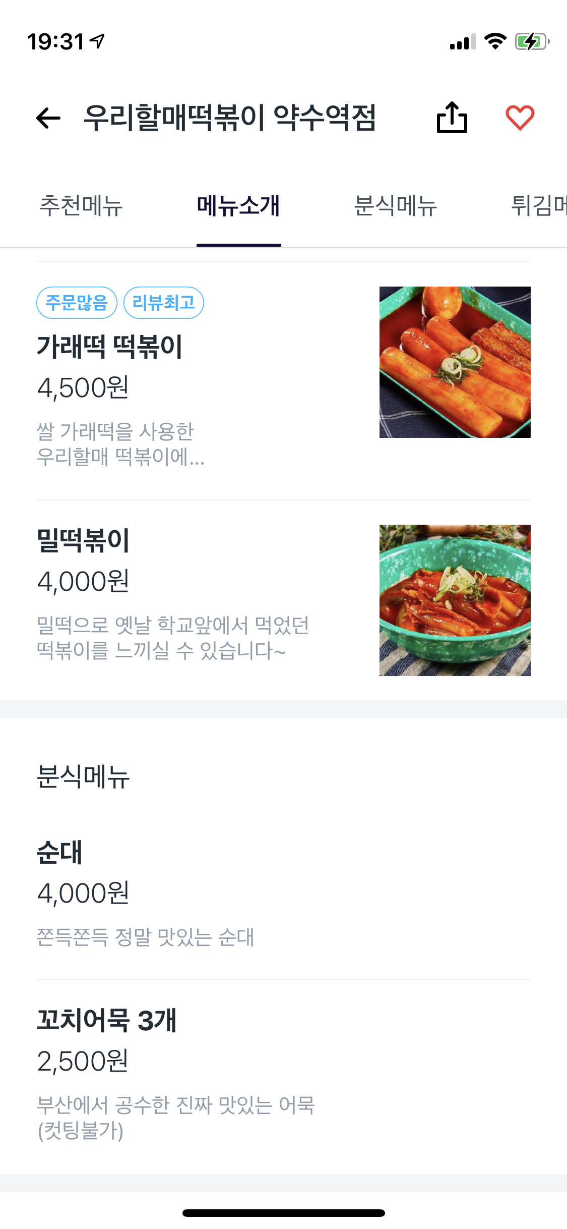 ➡️ 가래떡/밀 떡볶이, 할매튀김, 모듬튀김, 순대, 꼬치어묵