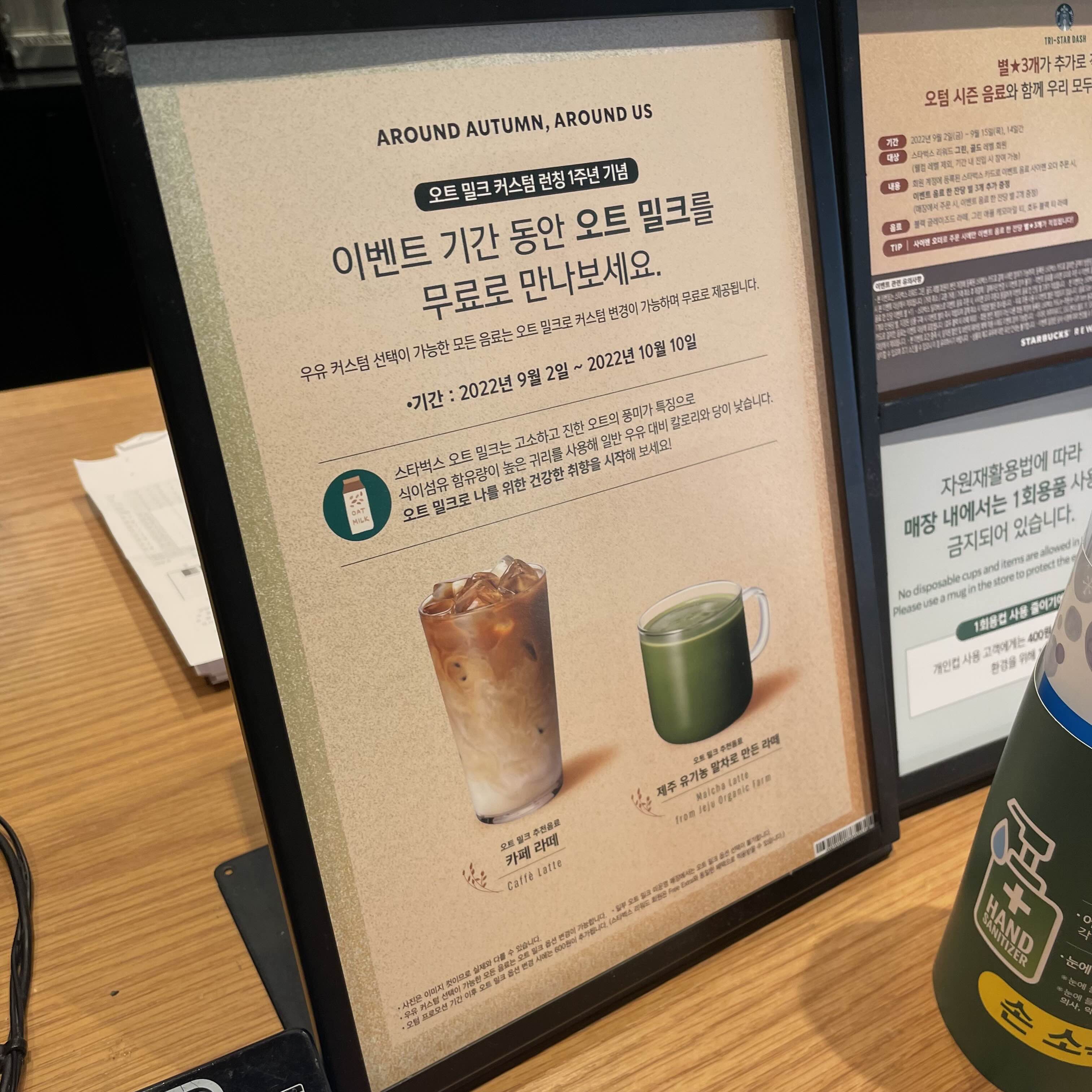 요즘 오트밀크 이벤트 하고 있던데 다음에 라떼 마실 때 한 번 추가해볼까 싶네요. 메가커피에서 아몬드우유로 옵션 변경해서 마셨었을 때 너무 맛없었던 기억이 있어서 스벅은 뭔가 다를 것인가 싶은데 ,, ㅎㅎ