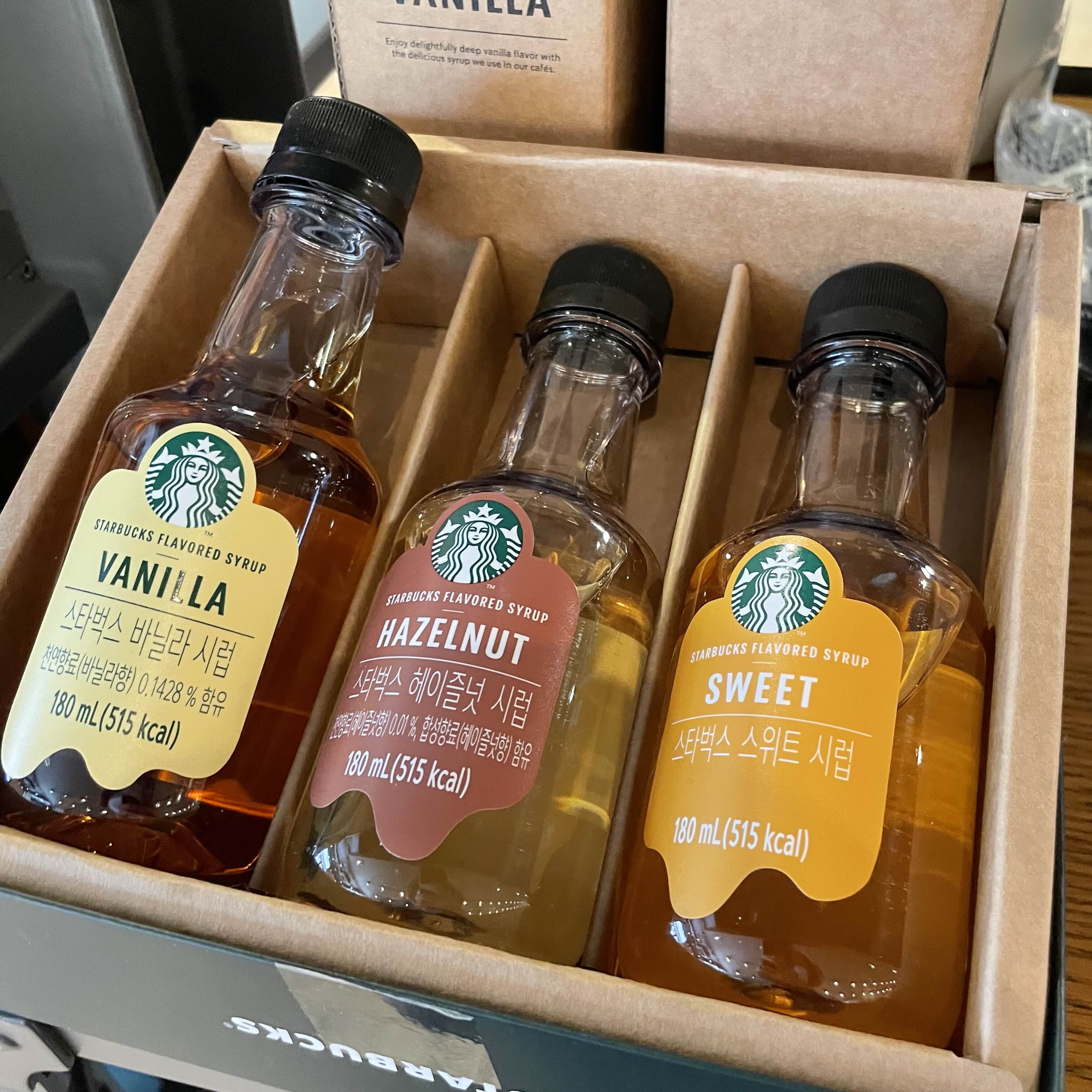 스타벅스 바닐라시럽, 헤이즐넛시럽, 스위트시럽도 있네요. 홈카페 하시는 분들은 구입해두시는 것도 좋을 것 같습니다.